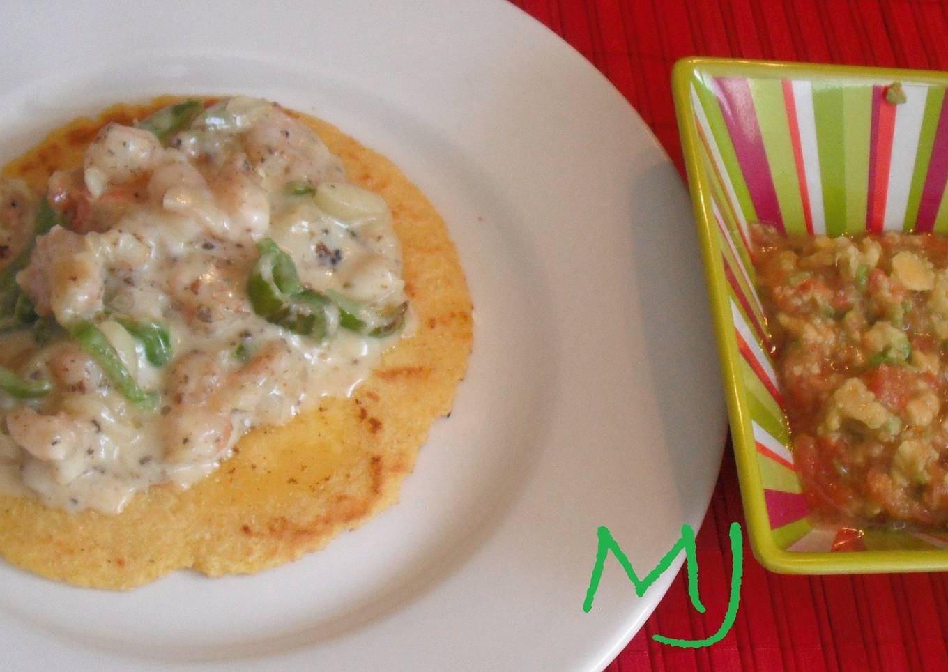 Tacos de camarones (gambas) con sofrito de cebolla, ajo y pimientos en tiras, se espolvorea con orégano y queso, se acompaña de aguacate y salsa picante.