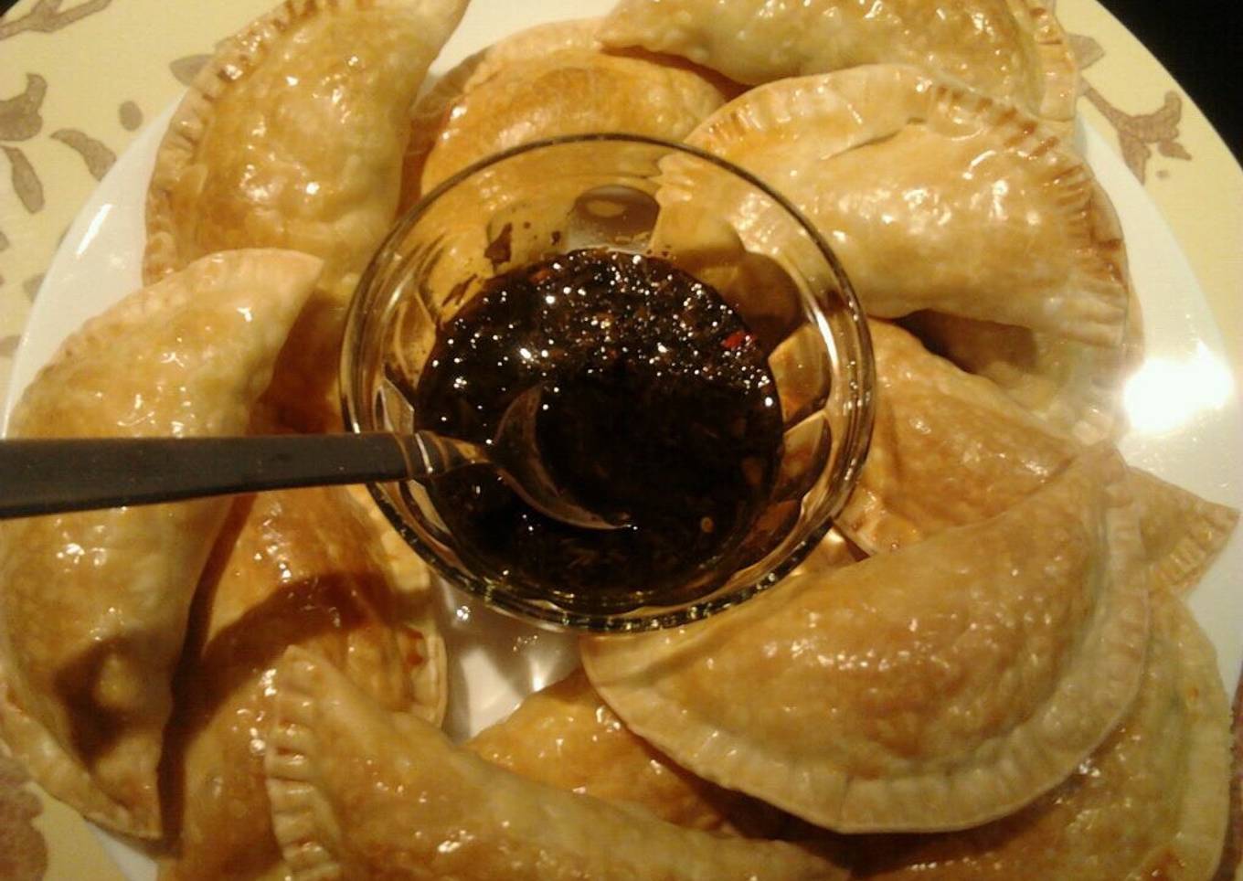 Empanadas rellenas con un sofrito de pollo, cebolla y pimiento morrón, con salsa mexicana...