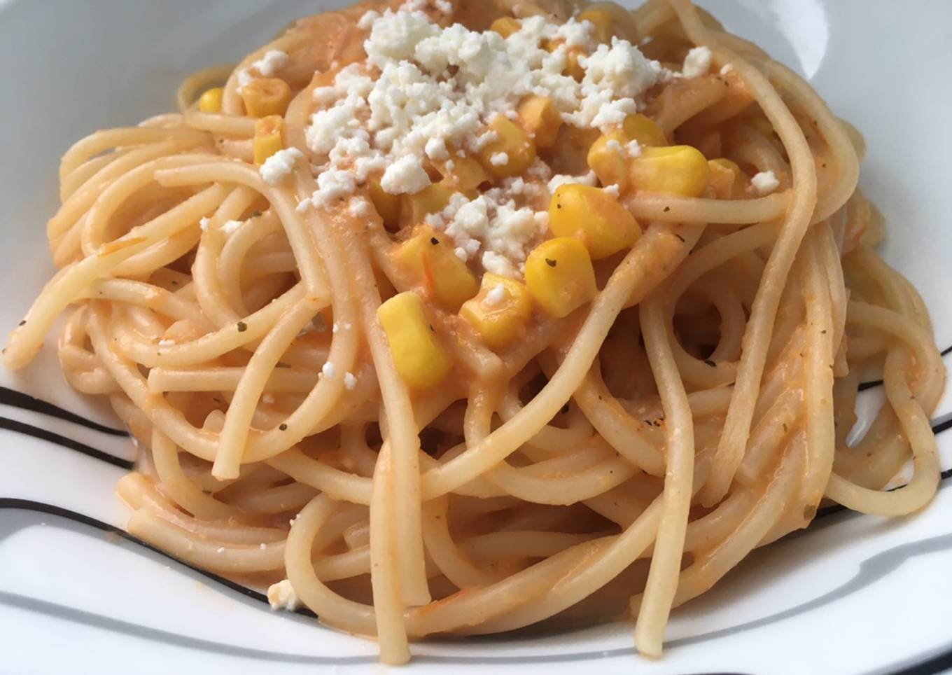 - Enseguida prendemos de nuevo la olla donde tenemos el espagueti y agregamos el caldo de jitomate y revolvemos. Dejamos que hierva y bajamos la flama. Dejamos hervir por 3 min y pasado los 3 minutos agregamos la crema y los elotes (aquí agregamos un poco de sal al gusto). Revolvemos y tapamos, dejamos hervir otros 3 min y listo. Servimos y decoramos con queso de mesa o queso fresco.