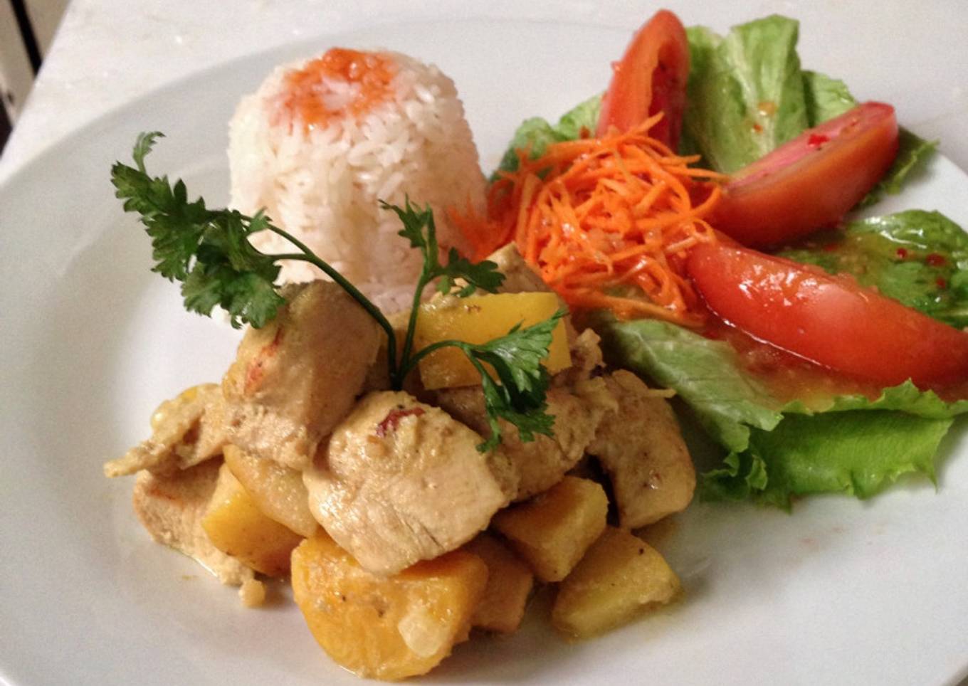 Pollo en dados con manzana y plátano maduro al curry