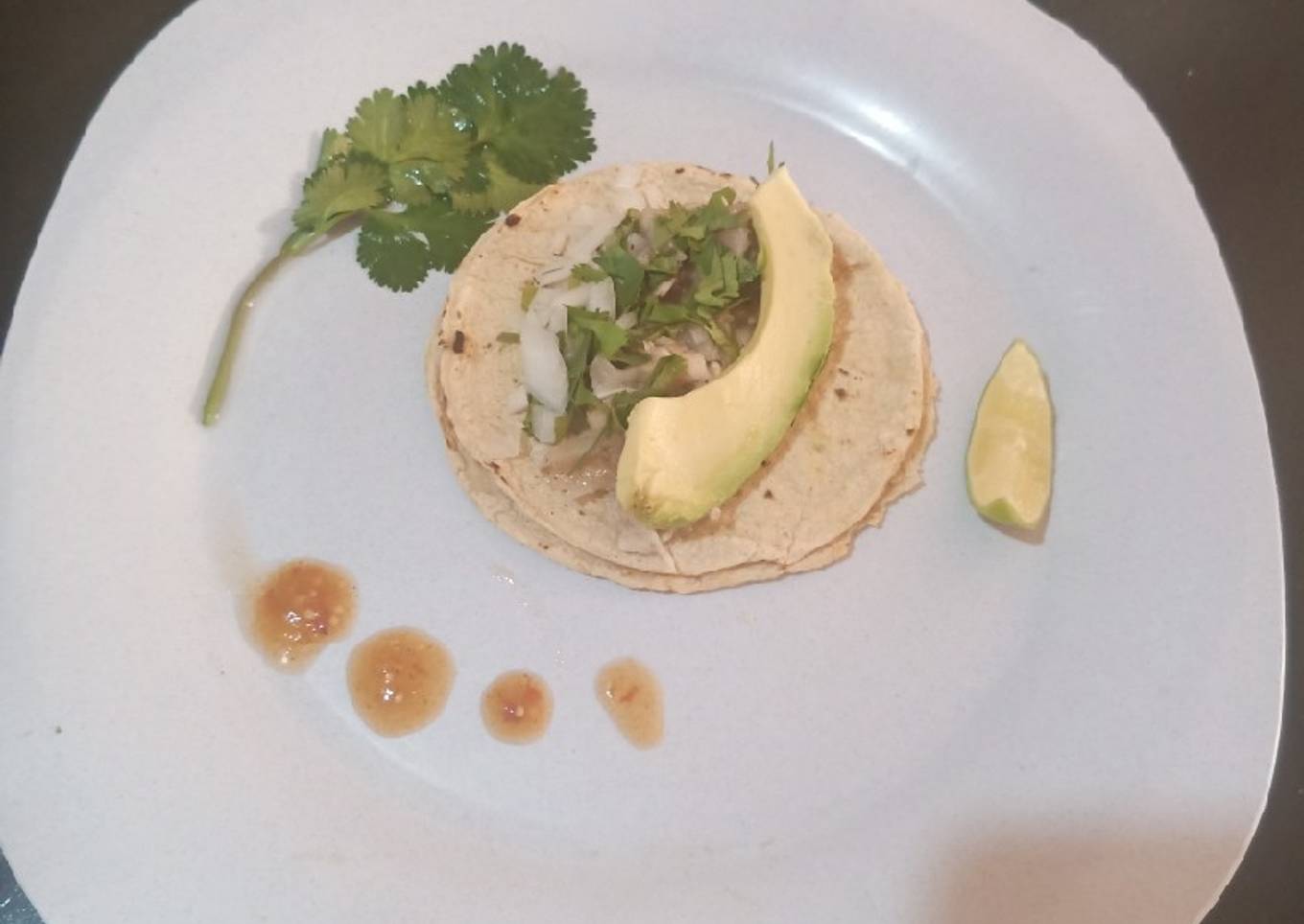 - Se coloca en un plato o recipiente la tortilla para después agregar sobre la tortilla la carne, cilantro, cebolla y un trozo de aguacate.